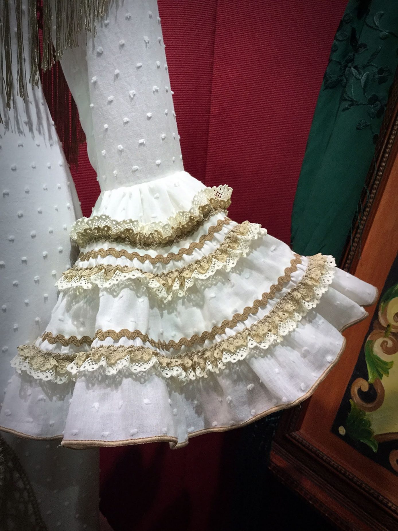 Traje canastero con subida en el talle, confeccionado en plumetti con adornos de encajes. Manga larga con detalles en los volantes. Disponible en varios colores.