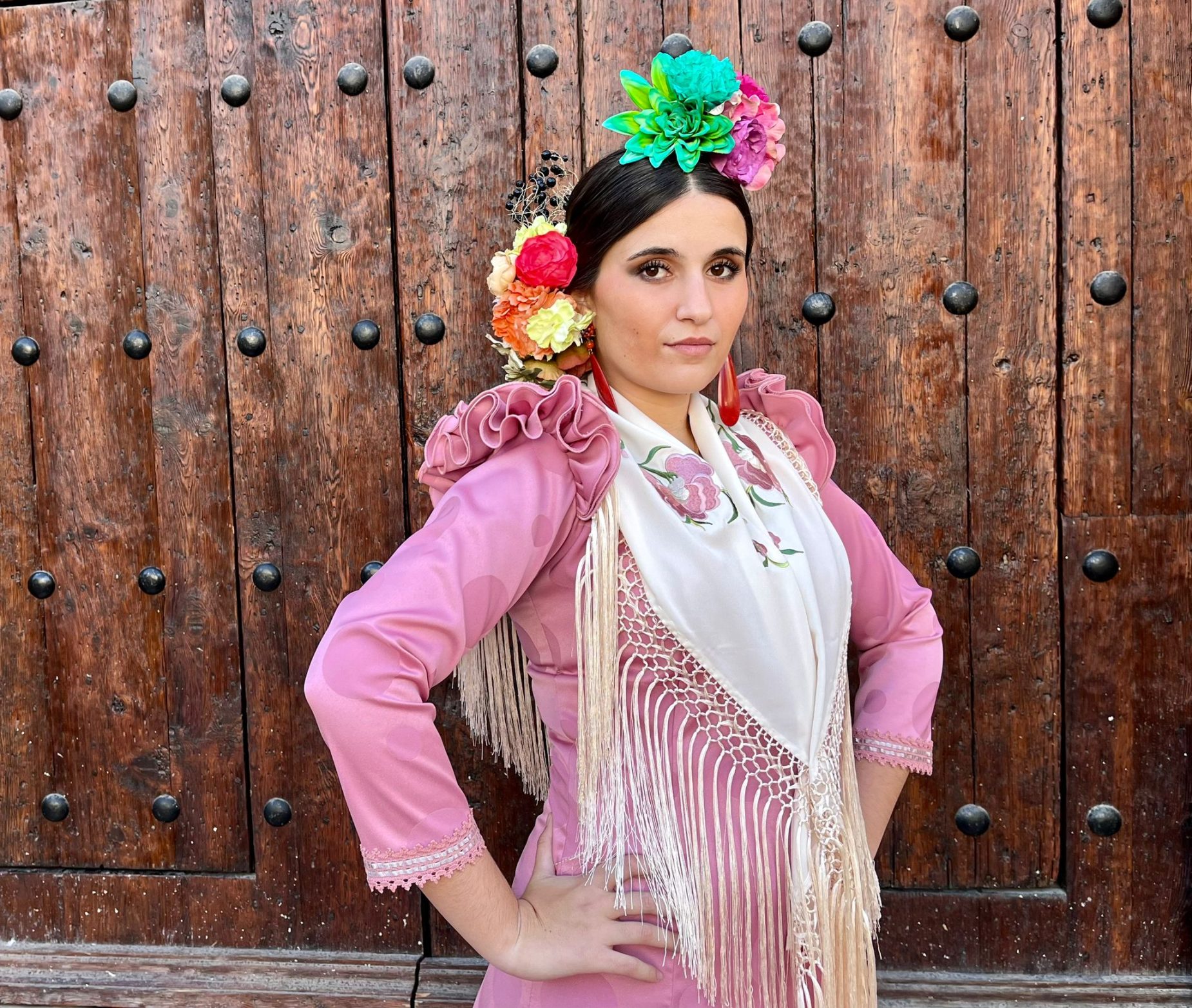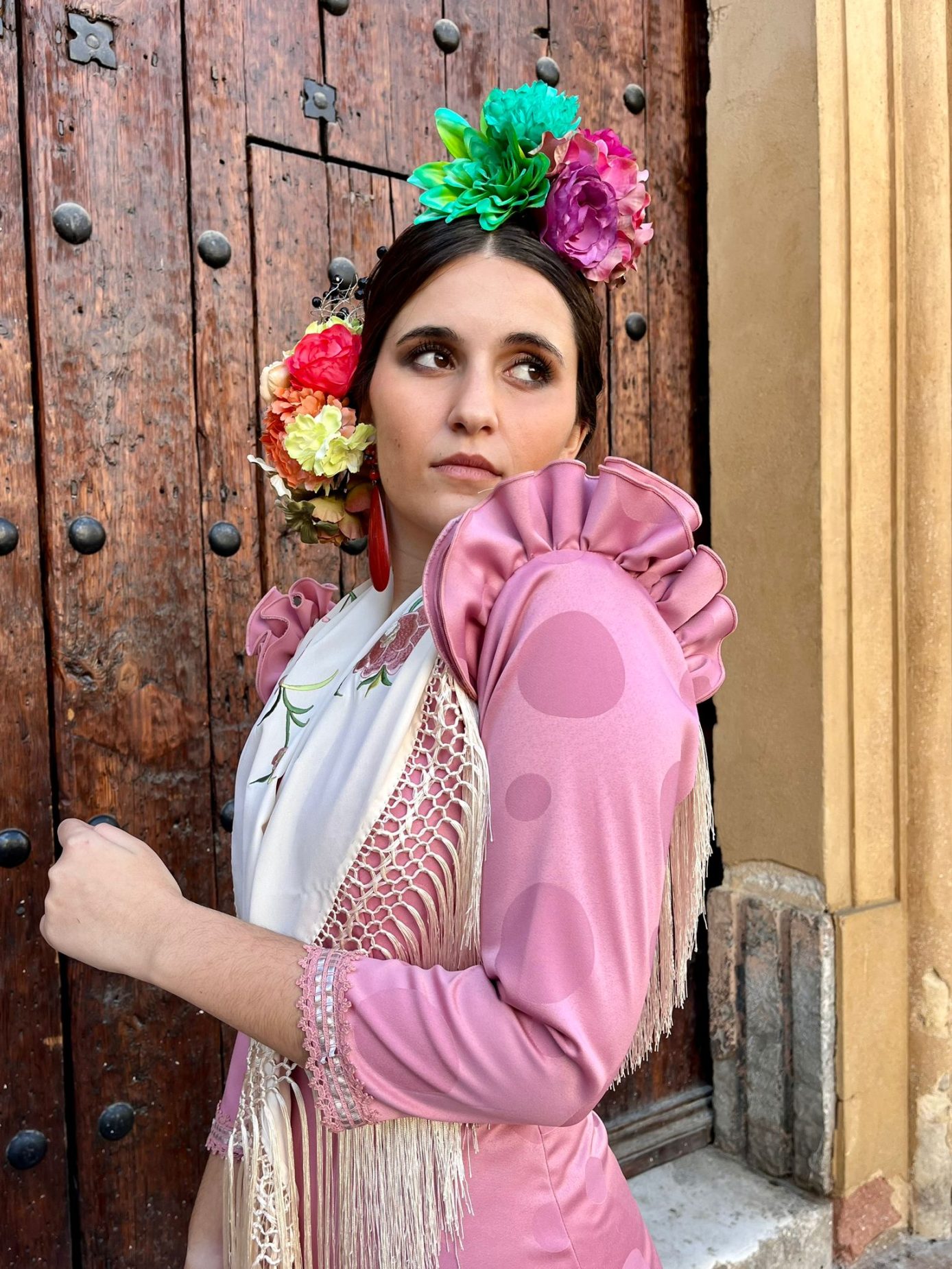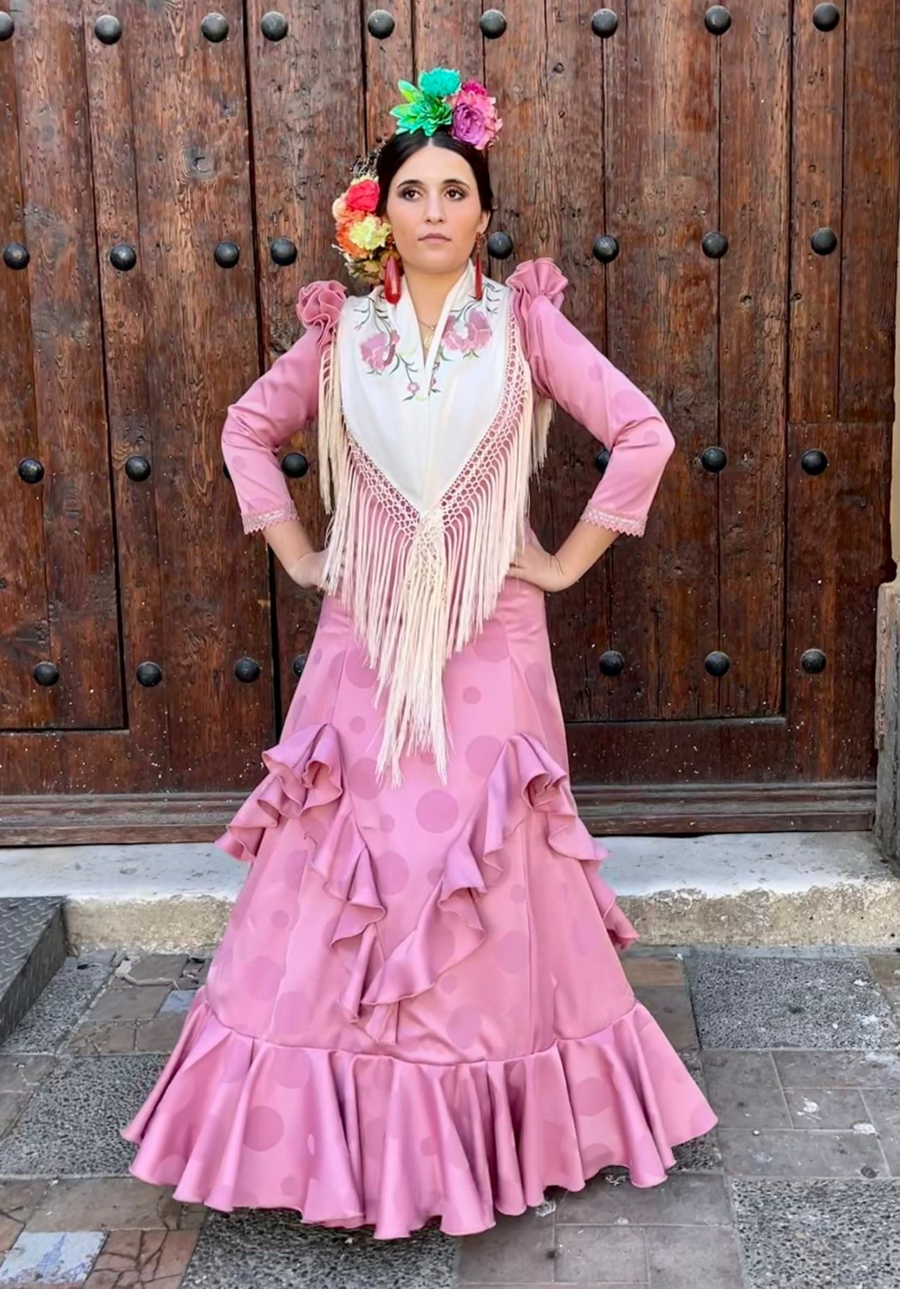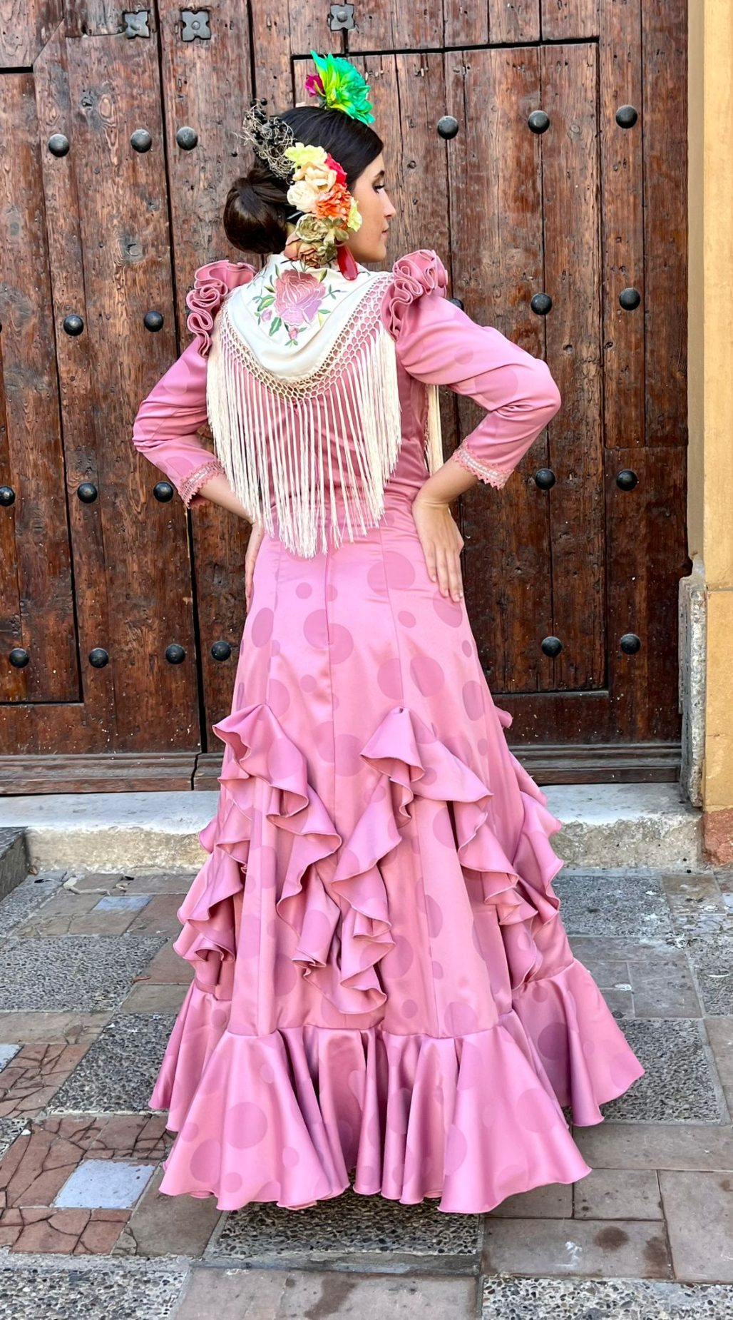 Vestido enterizo con volantes en forma de «V» que estilizan y alargan la figura. Manga larga con volantes en la sisa.
