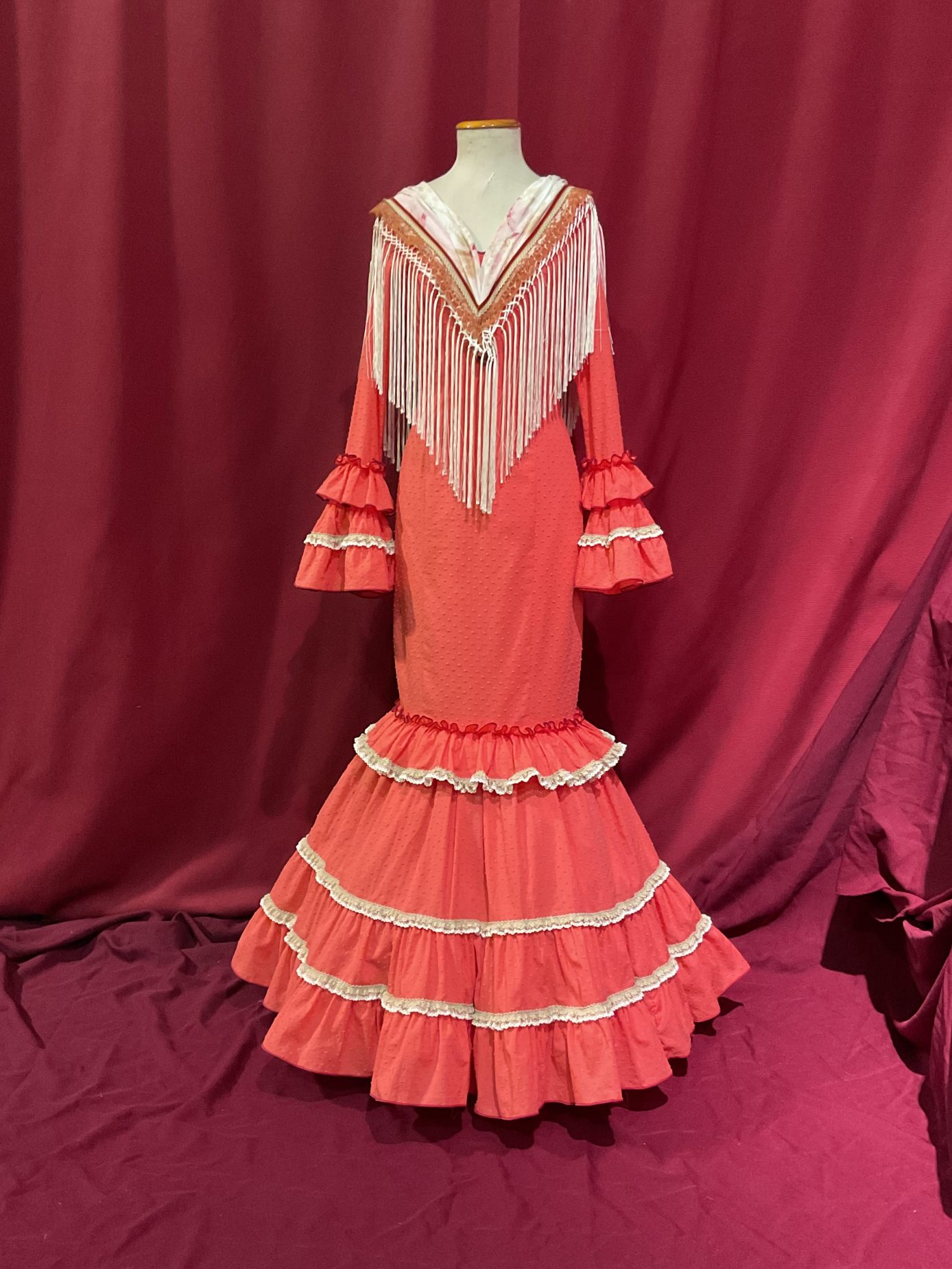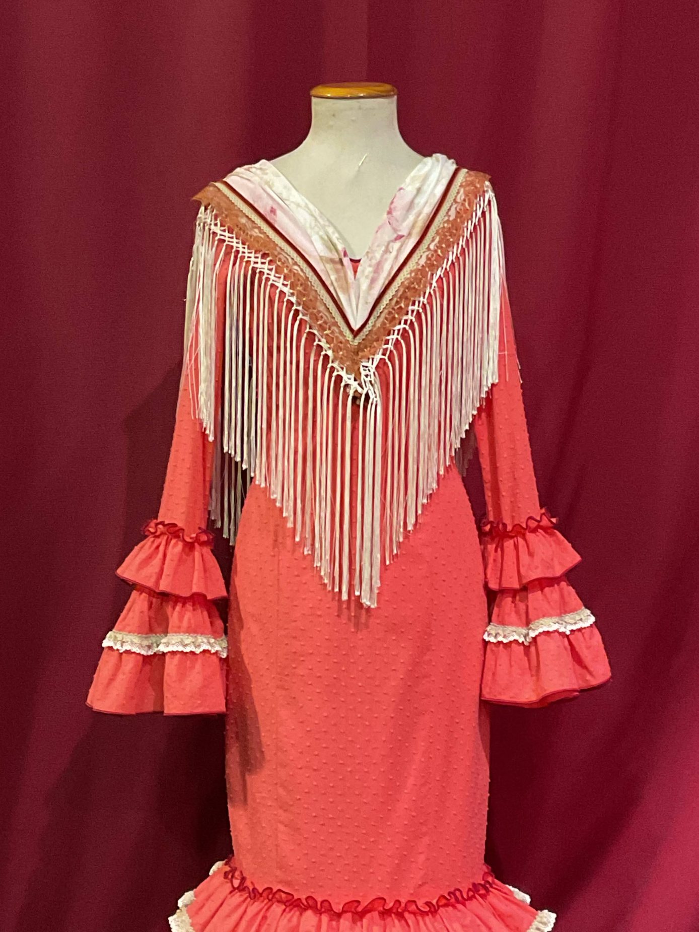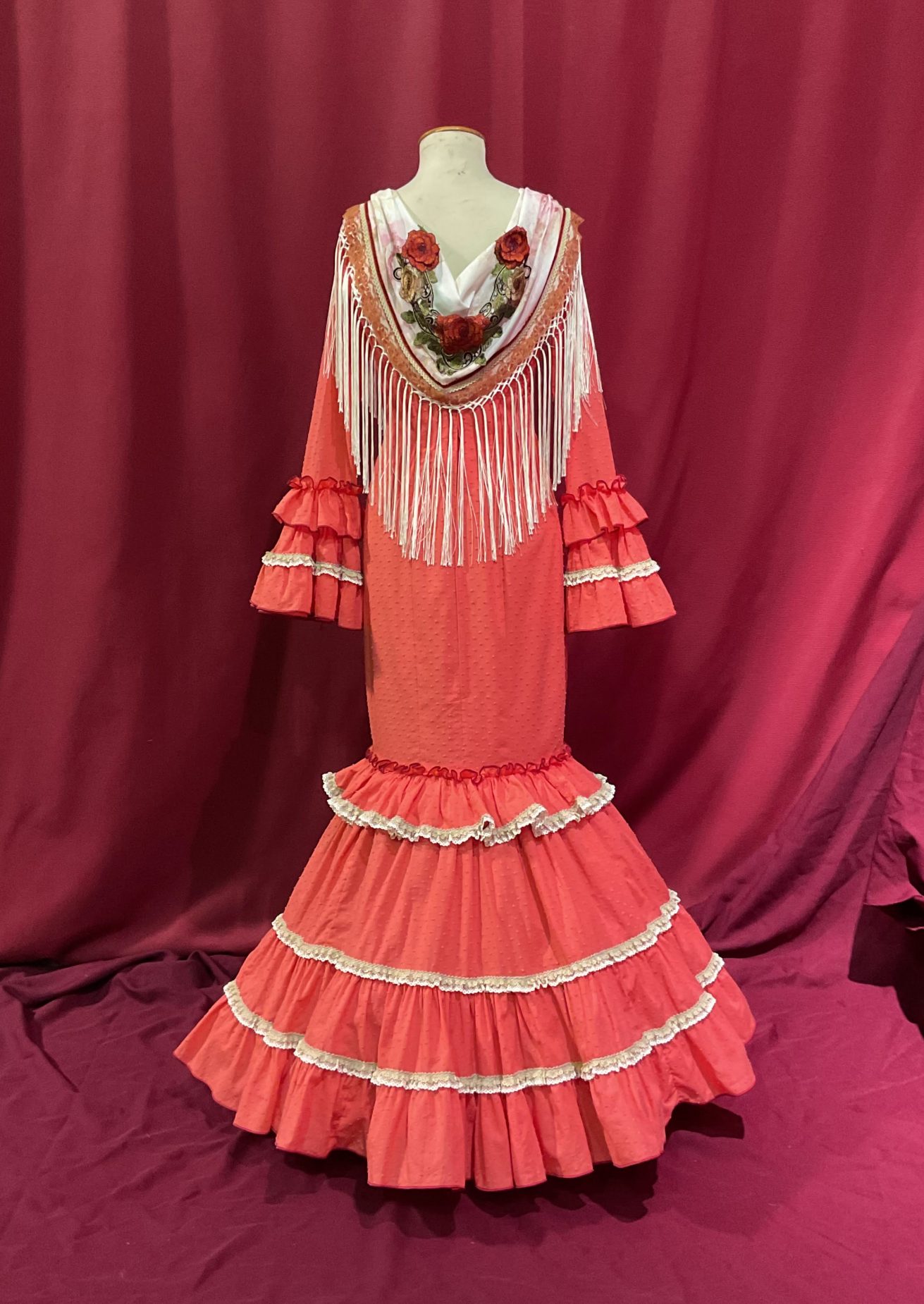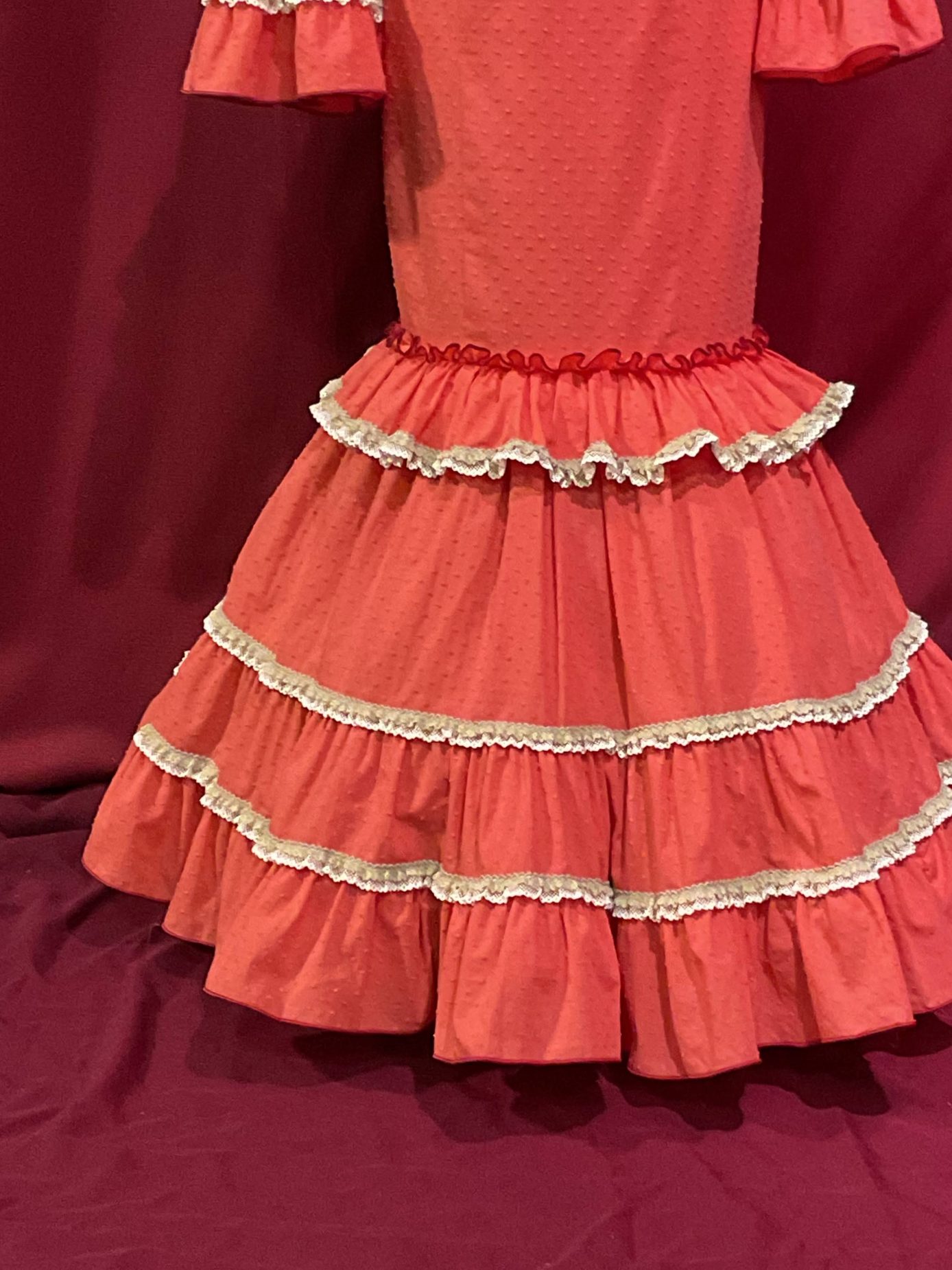 Modelo canastero con volante en el talle, presentado en plumeti rematado con encajes . Manga larga con volantes de similar disposición en el puño.