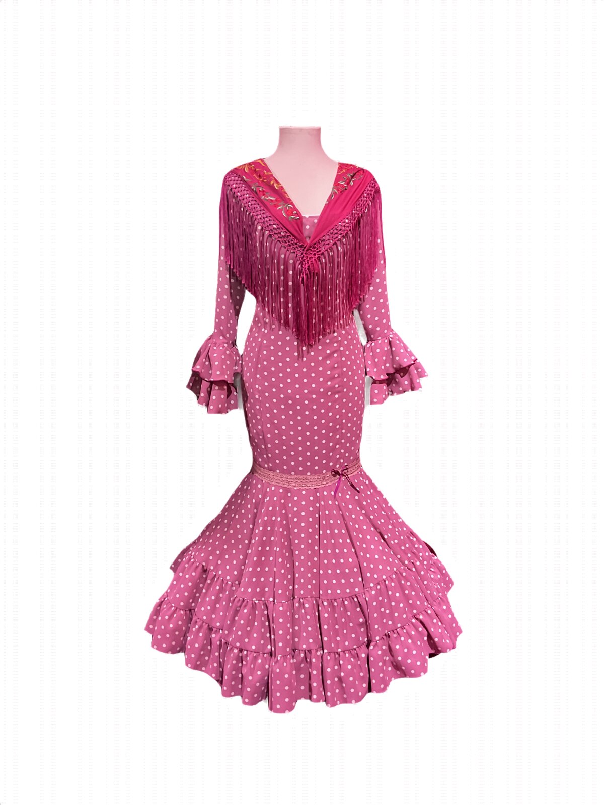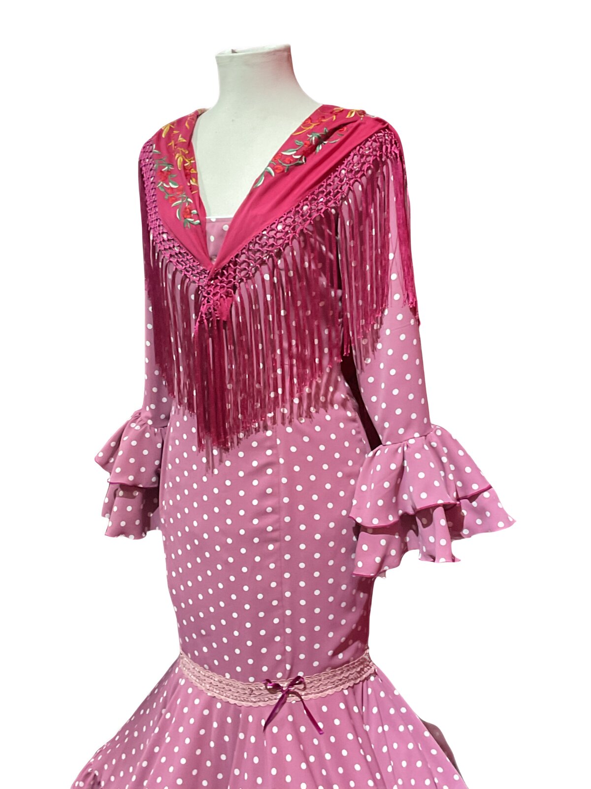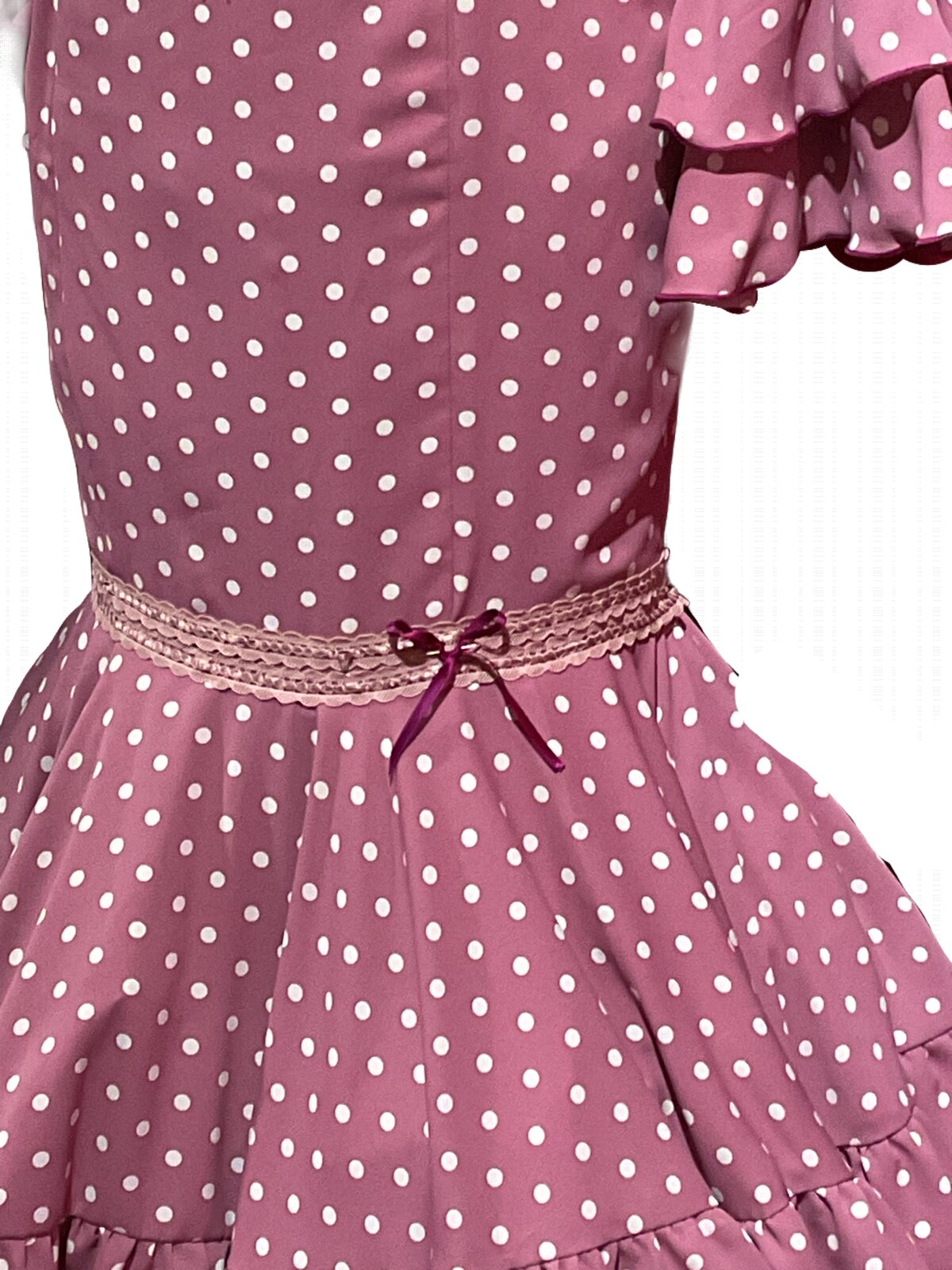 Vestido con talle bajo, y tres cortes canasteros. Adornado en el talle con un encaje. Cuenta con un can can extra que le da más volumen. Manga larga con volantes canasteros en el puño. Escotes delantero y trasero de pico.