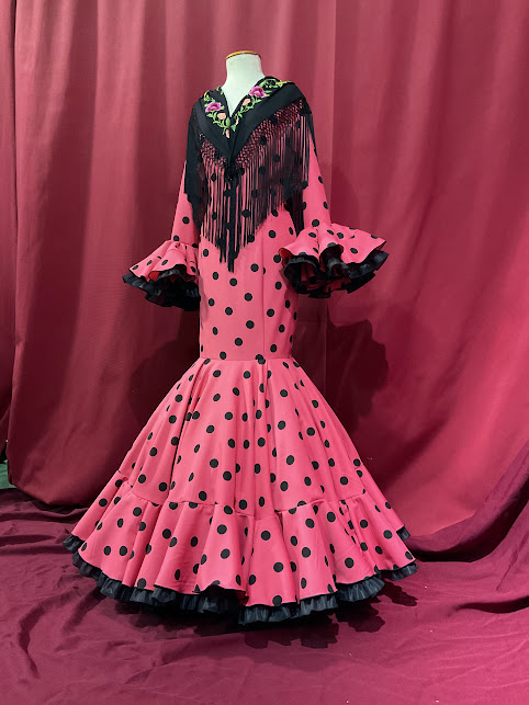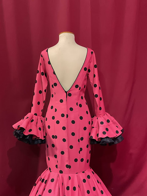 Vestido cortado al talle , canastero de capa con mucho vuelo en la falda y volumen , efecto clavel. Manga las con volante al puño con los mismos cortes. Escote delantero y trasero de pico.