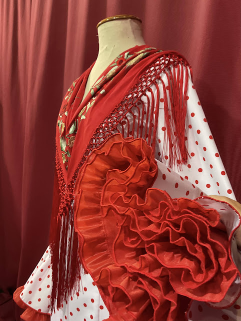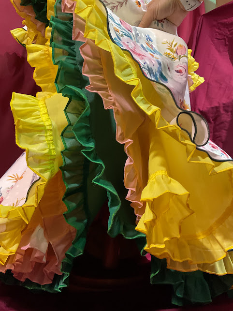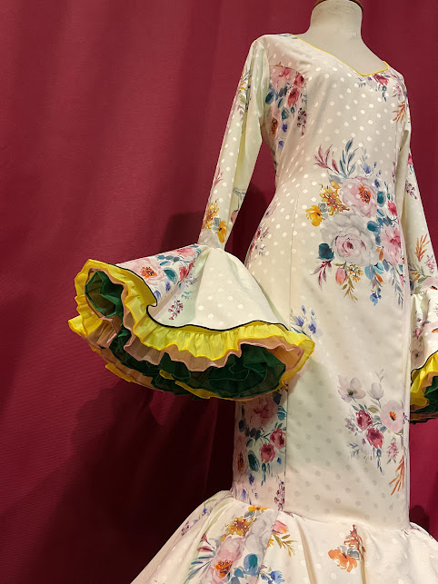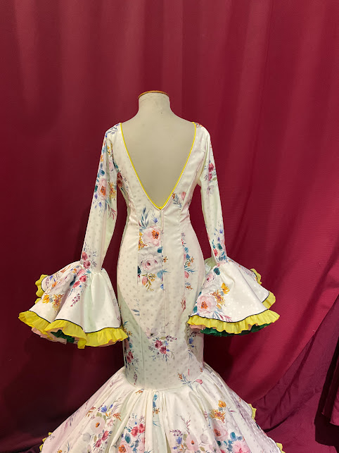 Modelo de capa con varios can can que le da ese volumen en la falda. Manga larga con volantes importantes con can can y adorno luna para elevar y dar movimiento. Escote delantero de pico y trasero bajo.