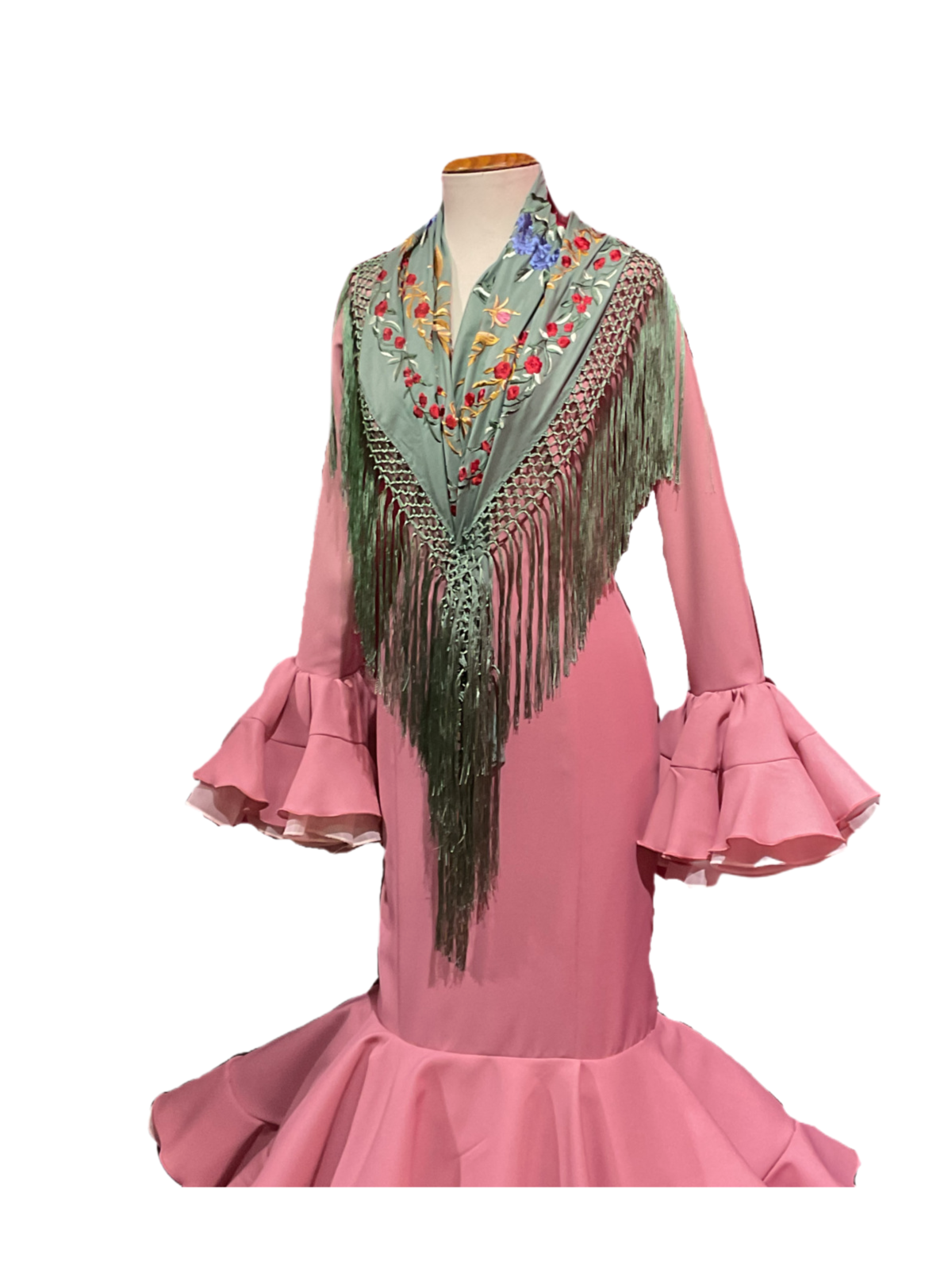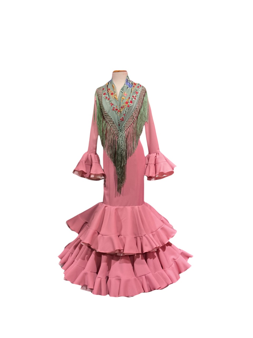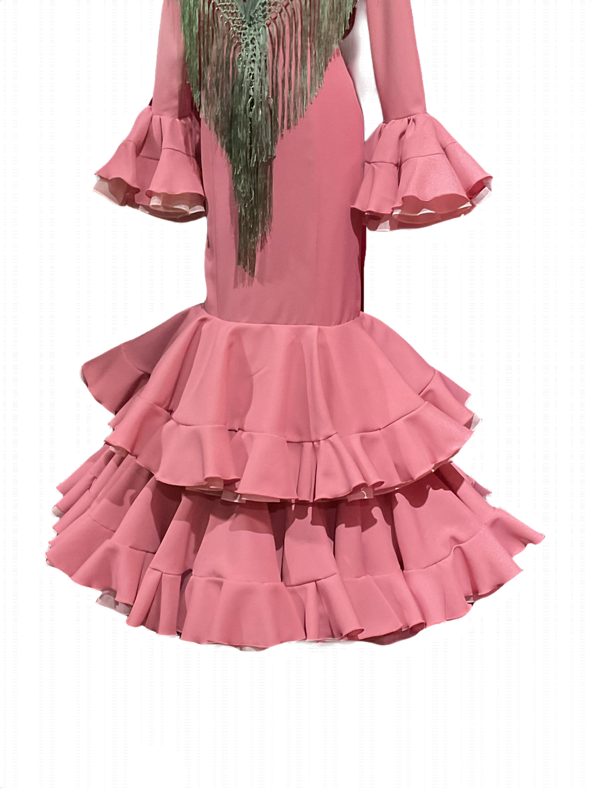 Adaptación de un clásico vestido de talle bajo con dos volantes de capa, con doble volante al filo y can can bajo cada volante y adorno luna que le da más volumen al vestido. Manga larga con volantes en la misma línea en el puño , escotes delantero y trasero de pico.