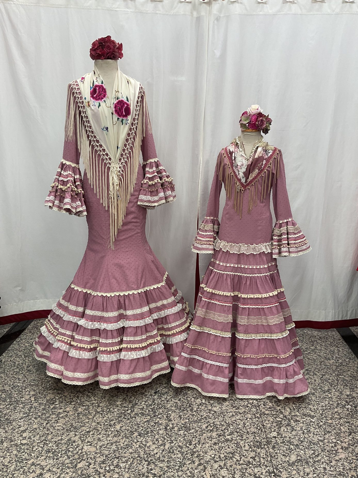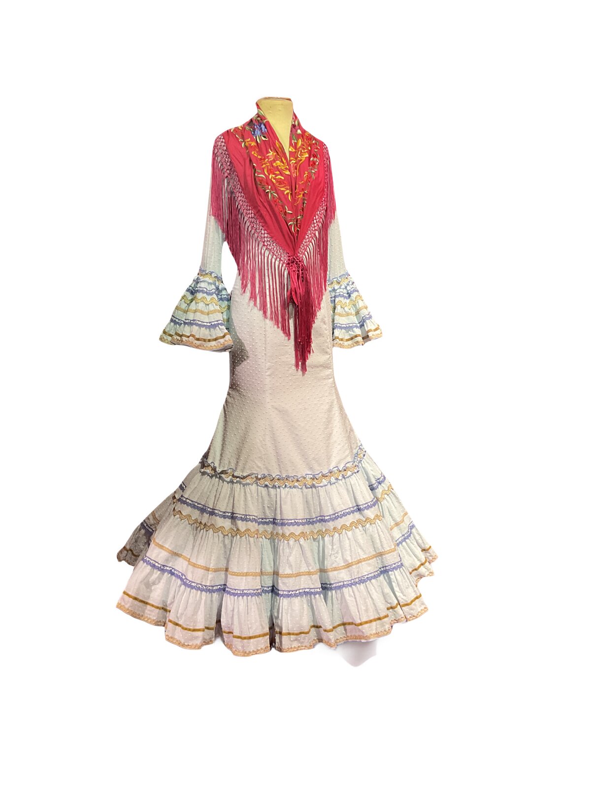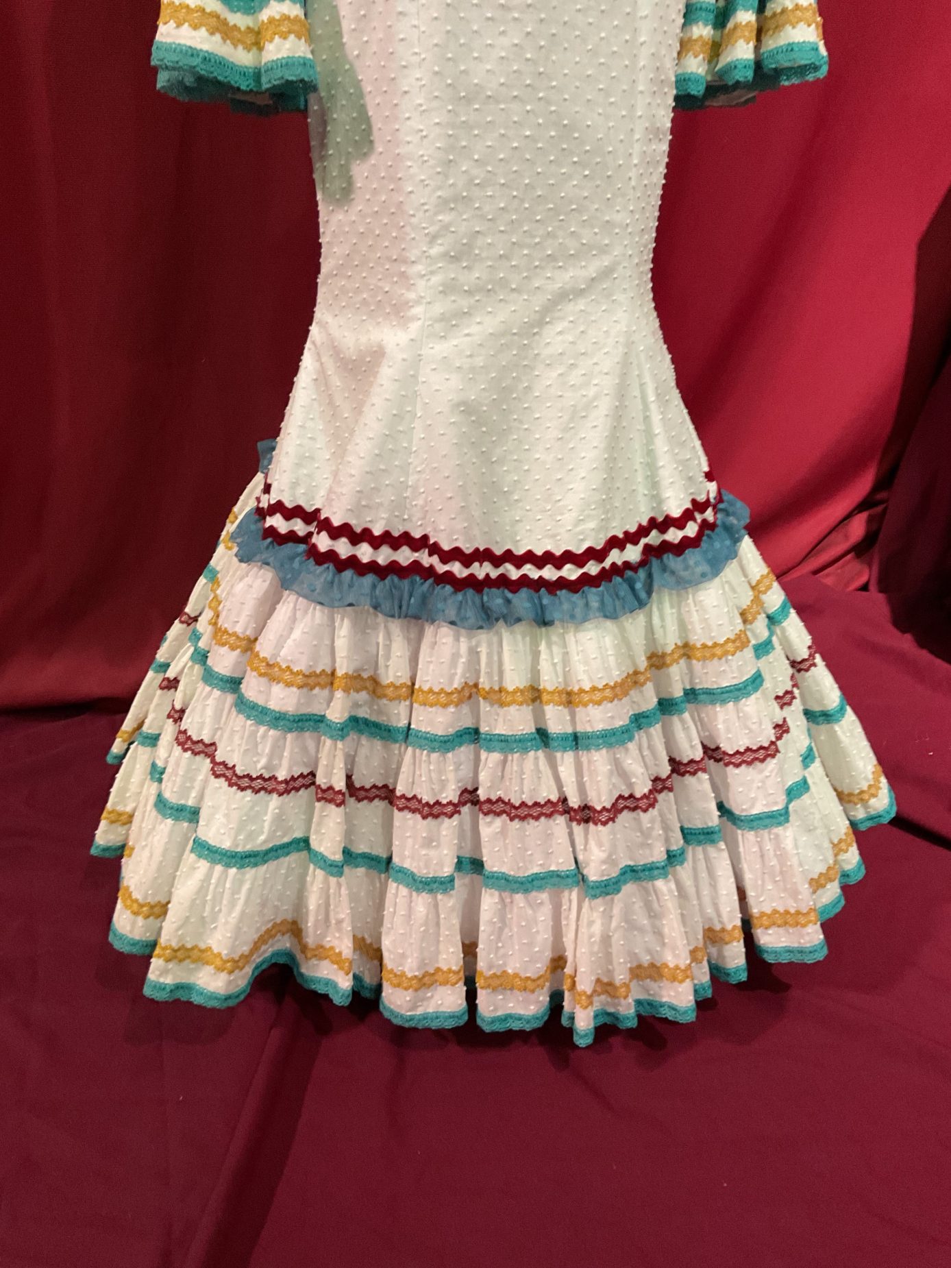 Diseño enterizo con rejas en falda y cortes canasteros, adornado con diferentes fornituras, escotes delantero y trasero de pico. Manga larga y volante similar a falda en el puño.