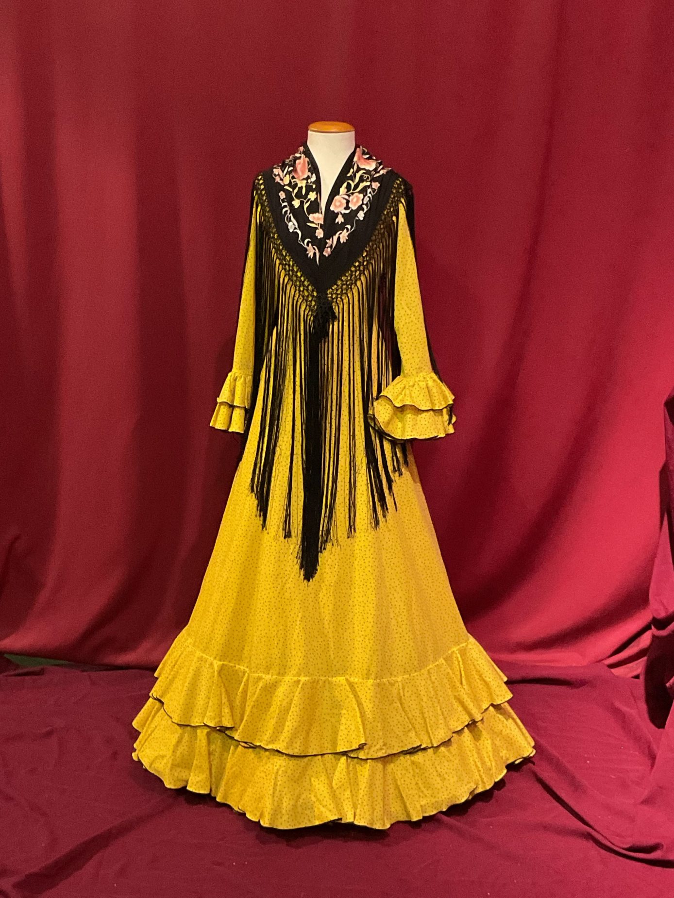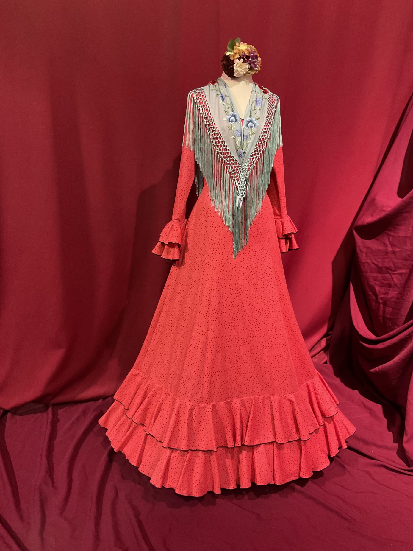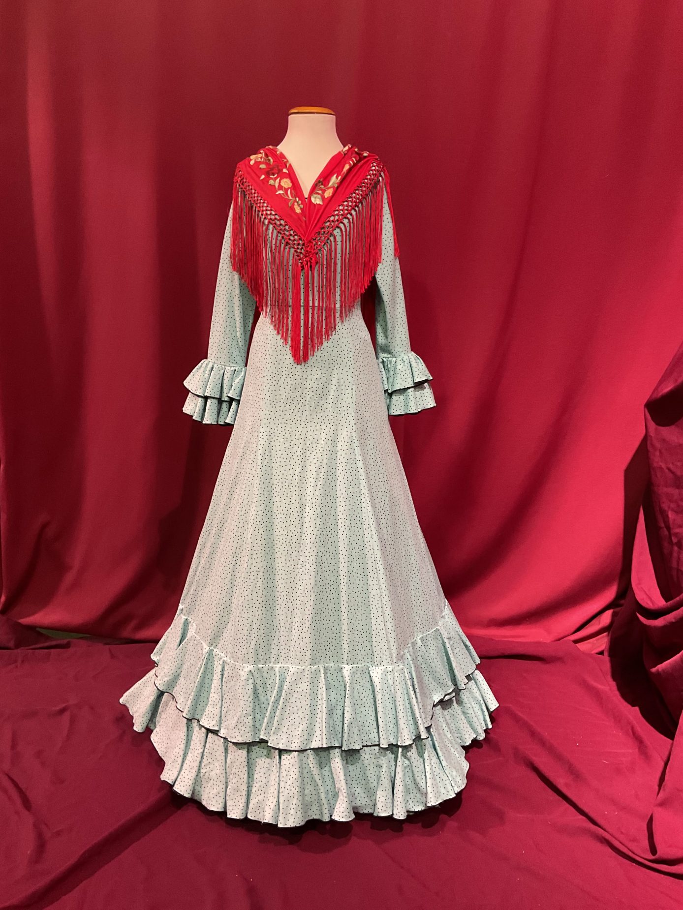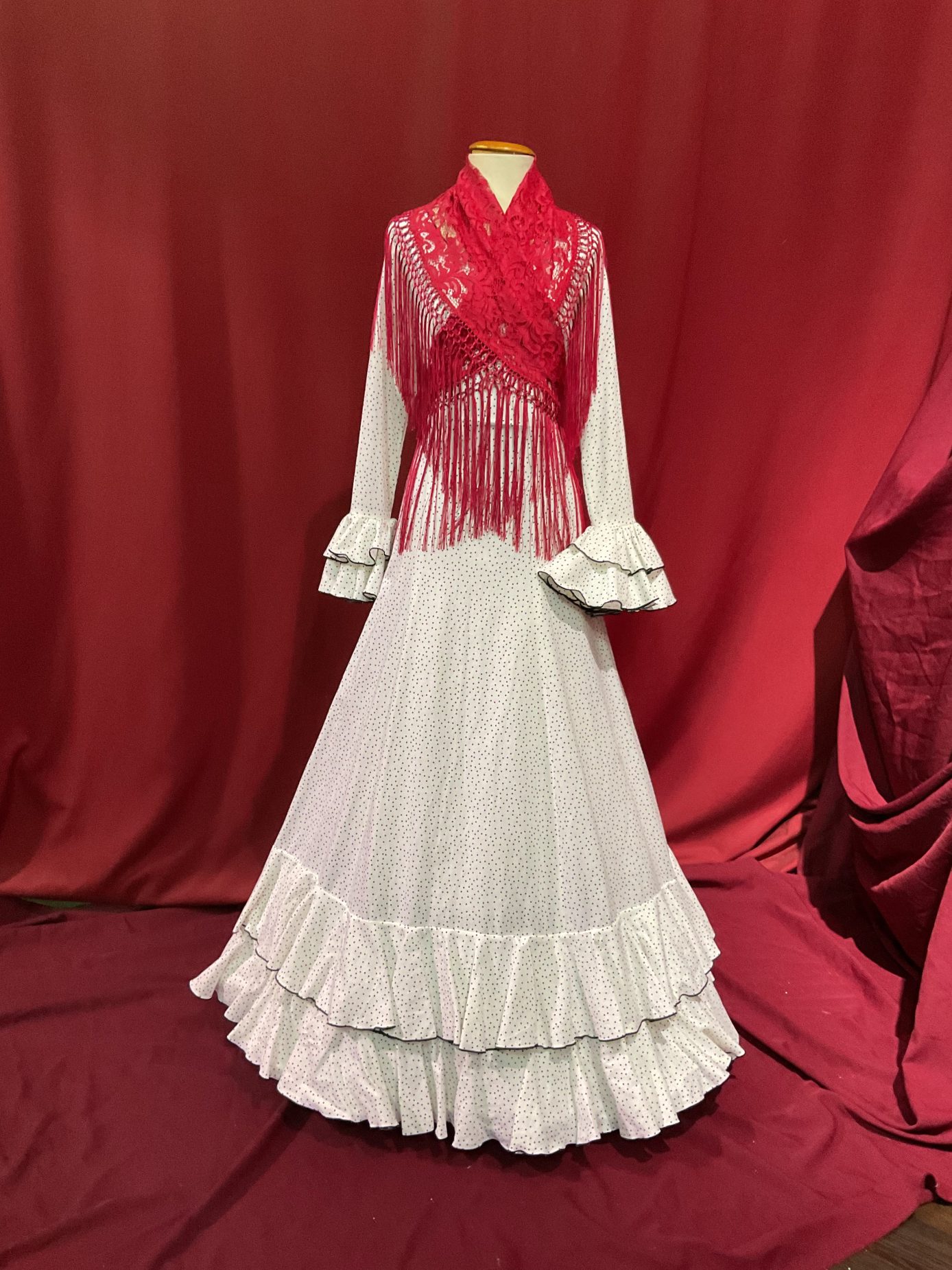 Vestido cortado en la cintura con falda enteriza de nejas  y dos volantes pequeños en el bajo de la falda. Manga larga con volantes en el puño. Escotes de pico delantero y trasero. Representado en distintos colores de Lino con lunar de lluvia negro.