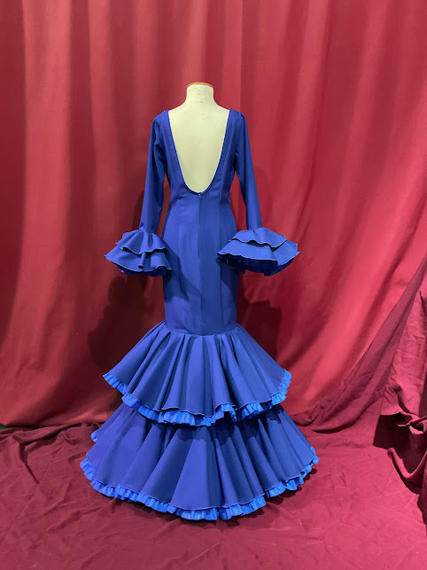 Modelo entallado con 2 volantes de capa dobles con can can y adorno luna . Con mucho volumen en la falda efecto clavel. Amplios escotes de pico delantero y trasero. Manga larga con volantes en su puño.