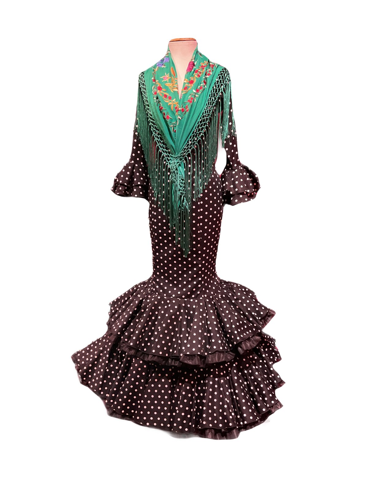 Modelo enterizo entallado con 2 volantes dobles en el bajo de la falda elevado con volante de can can y adorno luna. Manga larga con volantes en el puño.