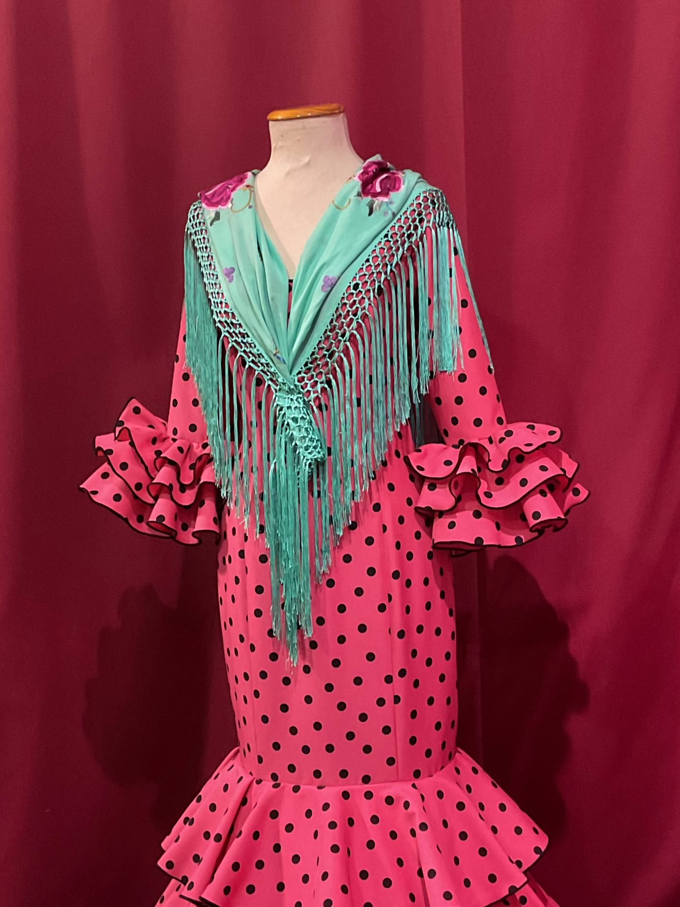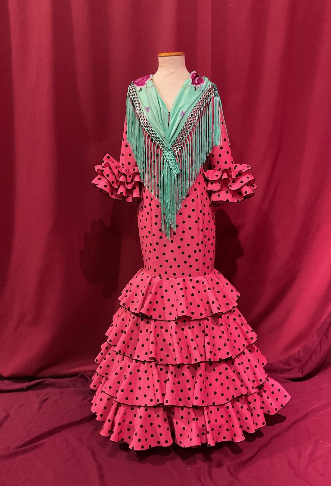 Un clásico de feria con 4 volantes de capa al talle y manga francesa con volantes en el puño.